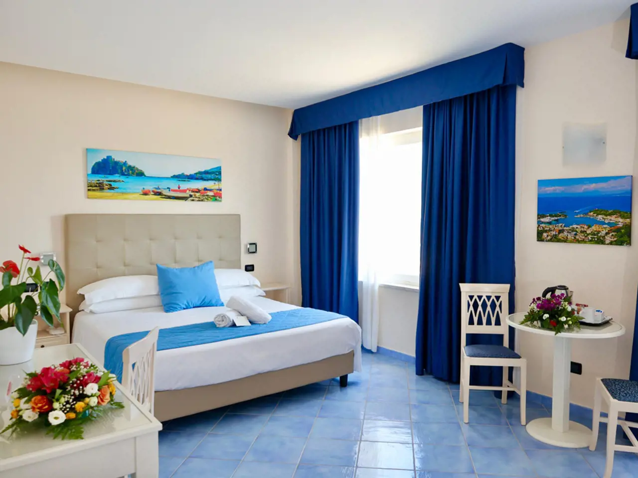 Они обставлены светлой мебелью в средиземноморском стиле, а стены и полы из керамической плитки синего цвета.